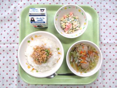 そぼろとごはんを混ぜるとごはんのうまみが倍増するそぼろごはん。大豆と枝豆の親子コンビがいい味を出しているビーンズサラダ。肉団子と白菜の組み合わせが「にく」い(おいしい)肉団子と白菜のスープ。いつも安定したたんぱく質・カルシウムを提供してくれる牛乳。今日もベストの献立、おいしい給食をありがとうございました。
