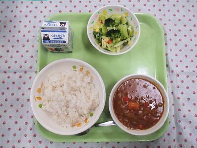 今日の献立は、ミートボールカレー、牛乳、ブロッコリーサラダでした。