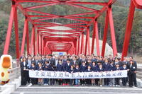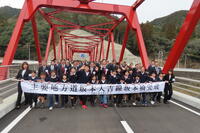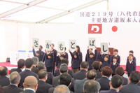 午前の坂本橋の完成式では、オープニングアトラクションとして、メッセージと合唱を披露しました。メッセージでは、豪雨災害での自然の恐ろしさや避難時の人のぬくもりなどを伝えました。また、坂本橋の橋名板を全員で書いたことも伝えました。合唱はSmile Againを歌いました。
