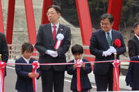 最後は、テープカットと坂本橋の渡り初めです。国土交通大臣や県知事の間に1・2年生が立ち、テープを持ちました。その後は、みんなで渡り初めです。車道の真ん中をみんなで渡りました。チクワンとも写真をとりました。