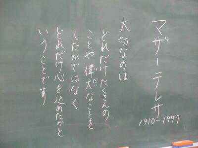 今日は恒例の読み聞かせでした。高学年では、マザーテレサの読み聞かせがあり、最後にマザーテレサの言葉を贈られました。