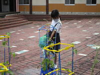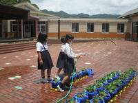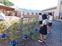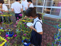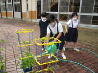 アサガオが暑さに負けないように、2年生が水やりをしてくれました。