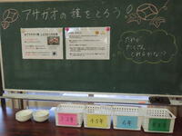 一人一人に種とりの袋を用意し、自分のアサガオの種は自分で取るようにしました。先生方にもがんばってもらいます。