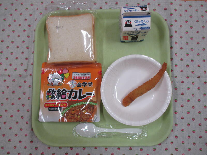 今日は水道水の不具合で、急遽、給食のメニューを変更しました。救給カレーを中心としたメニューとなりました。給食の先生方の工夫でししゃもフライに食パンもついて、急な変更でしたが、今日もおいしくいただきました。