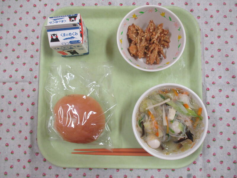 今日の献立は、ミルクパン、牛乳、春雨のタンタン麺、中華和え、メロンでした。