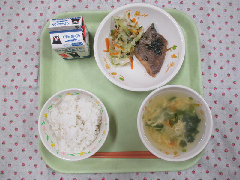今日の献立は、麦ごはん、牛乳、魚のにらソース、かきたま汁、昆布あえでした。