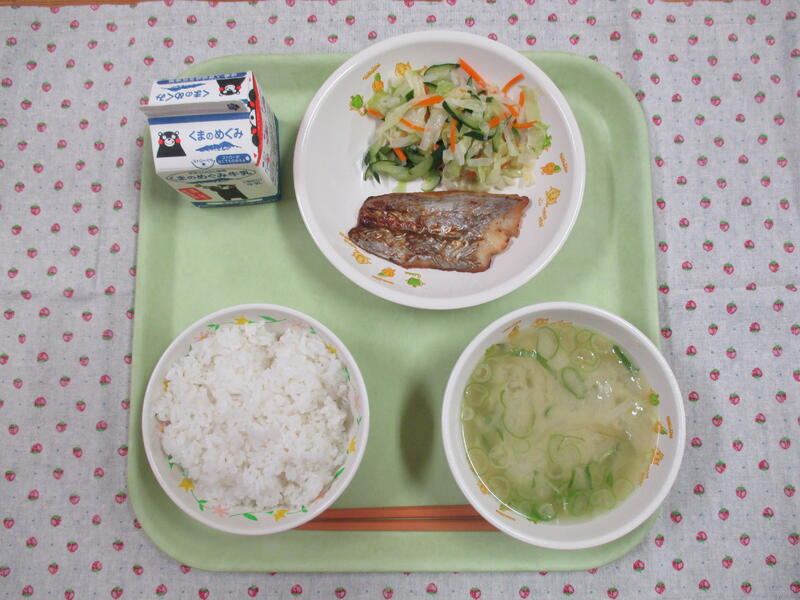 今日の献立は、麦ごはん、牛乳、魚のにんにく焼き、みそ汁、甘酢和えでした。