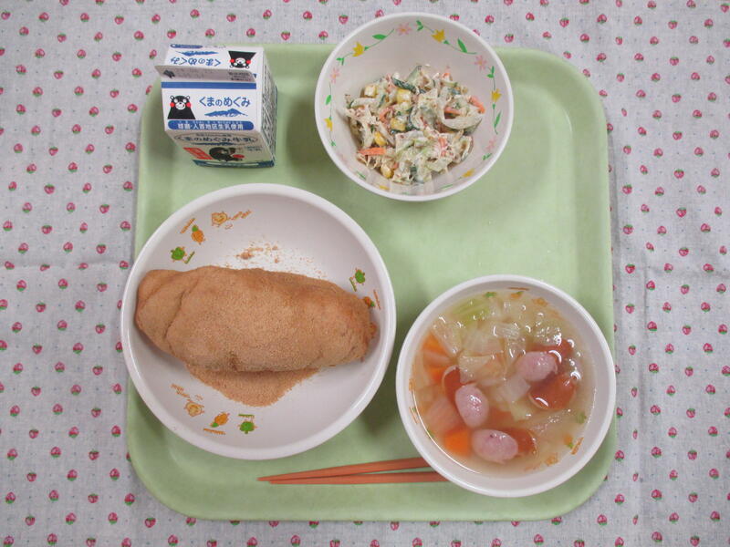 今日の献立は、きなこ揚げパン、牛乳、ポトフ、チキンサラダでした。