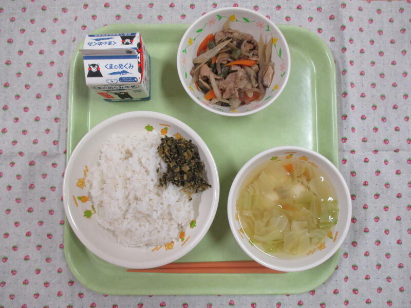今日の献立は、麦ごはん、牛乳、豚肉とごぼうの煮物、すまし汁、高菜の油炒めでした。