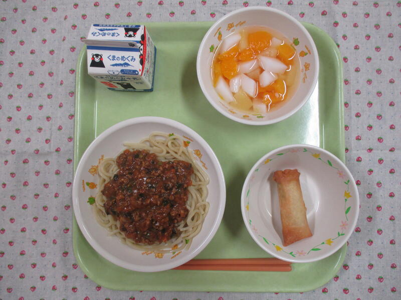 今日の献立は、ジャージャー麺、牛乳、春巻き、杏仁豆腐でした。
