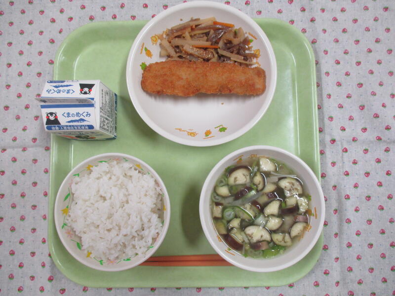 今日の献立は、麦ごはん、牛乳、太刀魚のフライ、みそ汁(なす)、じゃがいものきんぴらでした。
