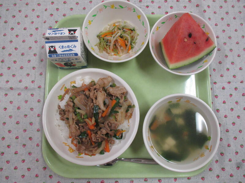梅雨に入り、蒸し暑いが続いていますが、その暑さをスタミナ丼が吹っ飛ばしてくれました。豚肉ににんじん、たまねぎ、にらなど具だくさんで、栄養満点の丼でした。それに昨日に続いて、すいかもついていました。今日もおいしくいただきました。