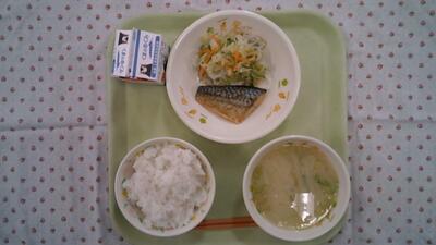 今日の献立は、麦ご飯、牛乳、さばの香味焼き、豆腐のみそ汁、れんこんのきんぴらでした。