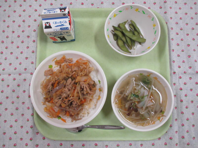 今日の献立は、豚にら丼、牛乳、甘酢あえ、すまし汁でした。