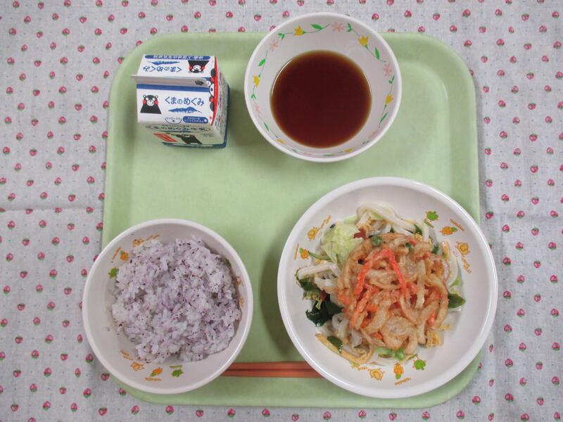 今日の献立は、麦ごはん、牛乳、きびなごのしょうがだれ、鶏汁、春雨の酢の物でした。