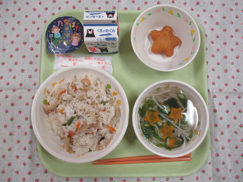 今月のふるさとくまさんデーでは、八代産のニラを使った魚のニラだれと上益城地方の郷土料理のいちょう葉汁でした。いちょう葉汁は、いちょう切りした大根や人参をいちょうの葉に、大豆や枝豆を銀杏に見立てた汁物です。それから、先日いただいた棚田米の新米が登場しました。熊本の味をかみしめながら、今日もおいしくいただきました。