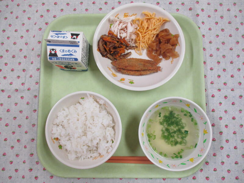 今日は、きびなごのしょうがだれでした。きびなごは、栄養価がとても高く、特に記憶力や学習能力の向上に役立つ栄養素が含まれているそうです。これで八竜小の学習能力も上がったことでしょう。今日は、しょうがの風味や旨味たっぷりのたれがかかっていて、今日もおいしくいただきました。