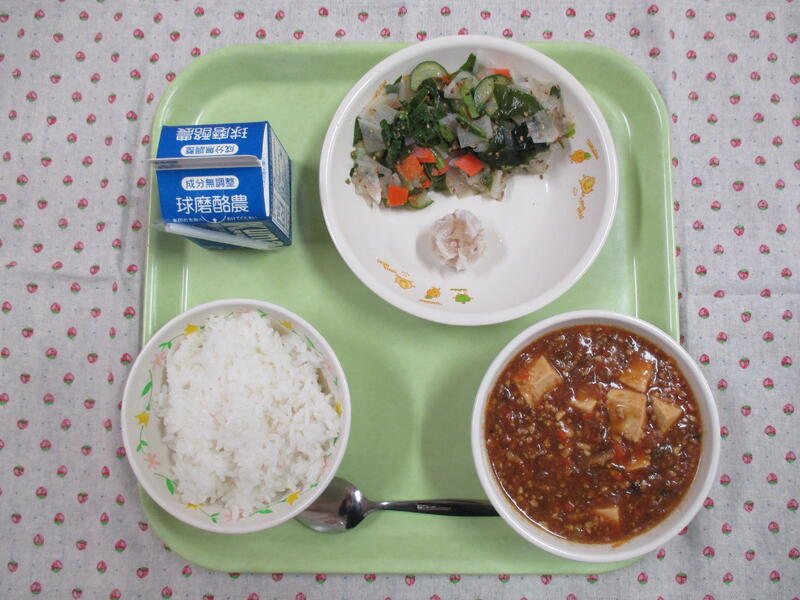 今日の献立は、麦ごはん、牛乳、マーボー豆腐、中華サラダでした。
