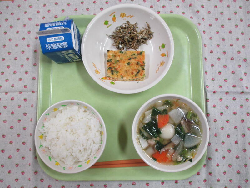 今日の献立は、食パン、牛乳、オムレツ、冬瓜と肉団子のスープ、ポテトサラダでした。