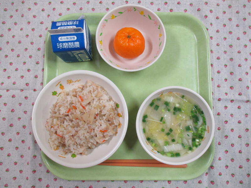 今日の献立は、麦ごはん、牛乳、豚肉とごぼうの煮物、すまし汁、高菜の油炒めでした。