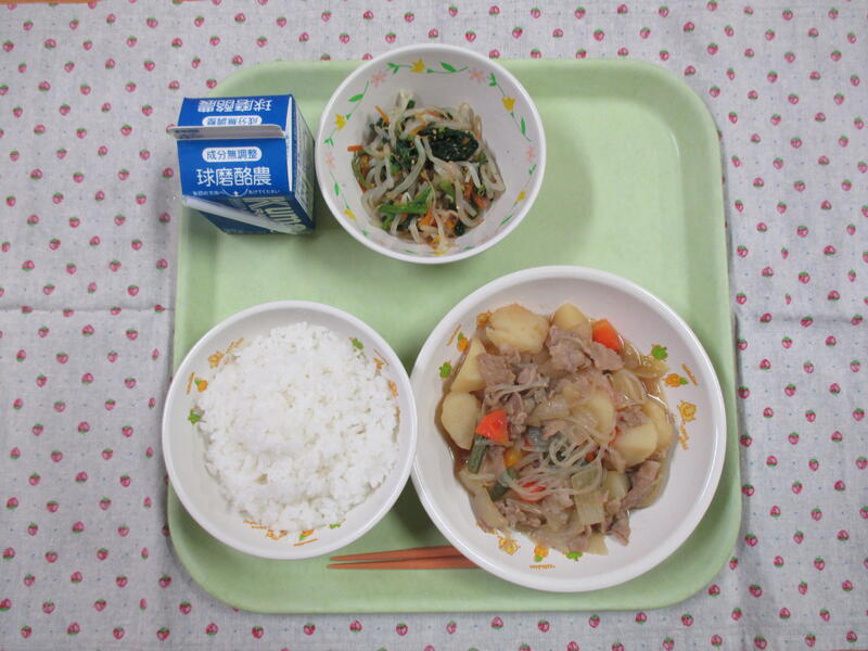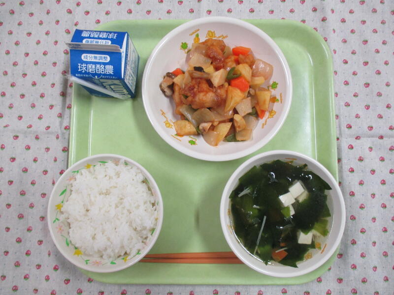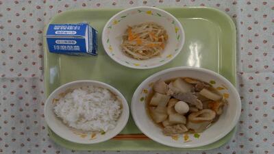 今日の献立は、麦ごはん、牛乳、鶏肉の梨ソースかけ、みそ汁、しょうが入りきんぴらでした。