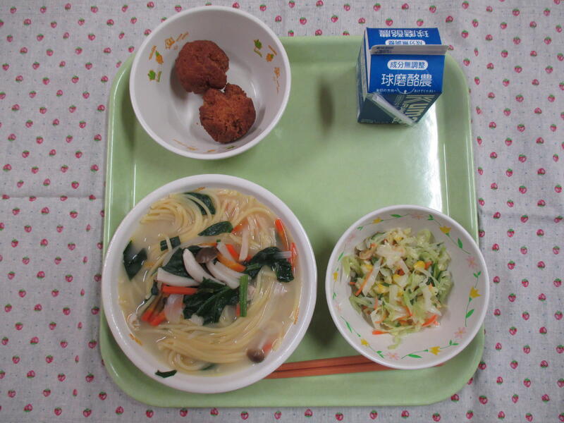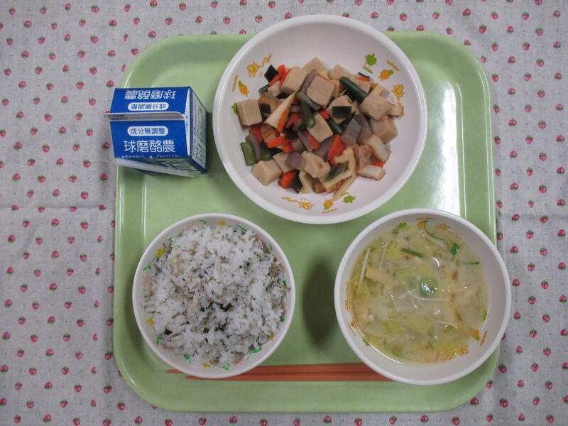 今日の献立は、ゆかりごはん、牛乳、かき揚げ、冷やしうどんでした。