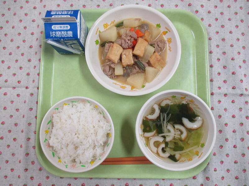 今日は、ごぼう、にんじん、しいたけ、鶏肉など具だくさんの五目汁でした。さっぱりした中にも、コクがあり、食材の味がしっかり出ていました。今日もおいしくいただきました。