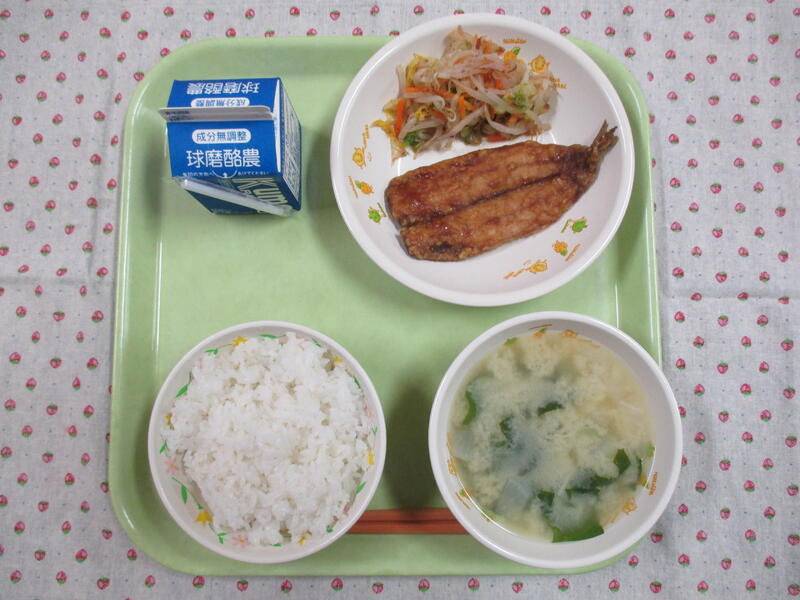 今日の献立は、麦ごはん、牛乳、魚のにんにく焼き、みそ汁、甘酢和えでした。