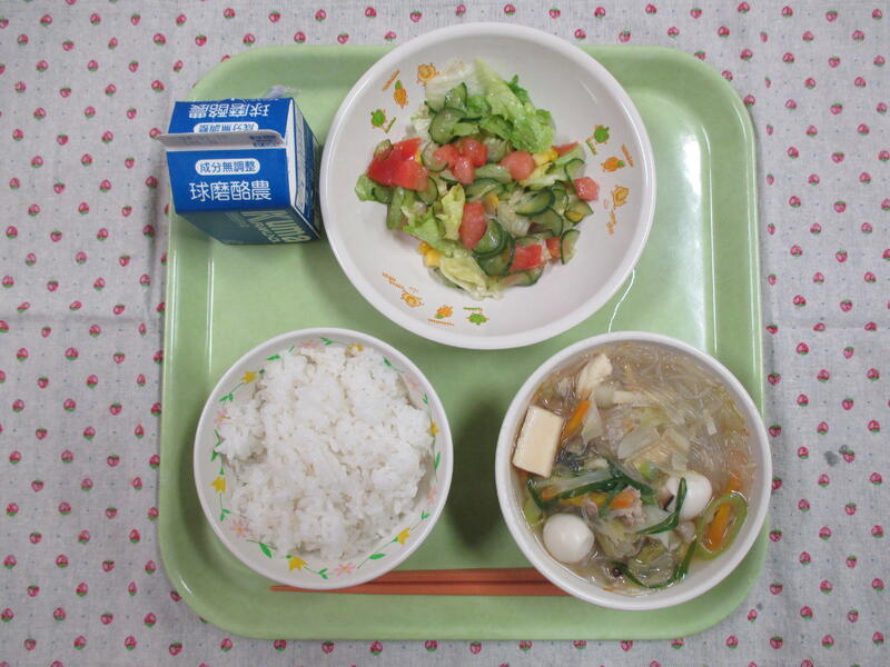 今日のごま酢和えは、春雨ににんじん等を和えてあり、彩り華やかでさっぱりとした味付けでした。きゅうりやキャベツのシャキシャキ感が、いいアクセントとなり、食欲が増しました。今日もおいしくいただきました。