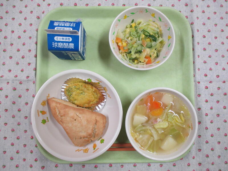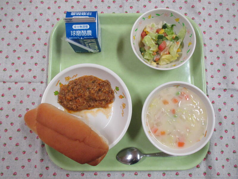 今日の献立は、ミルクパン、牛乳、アンサンブルエッグ、ポテトスープ、トマトサラダでした。