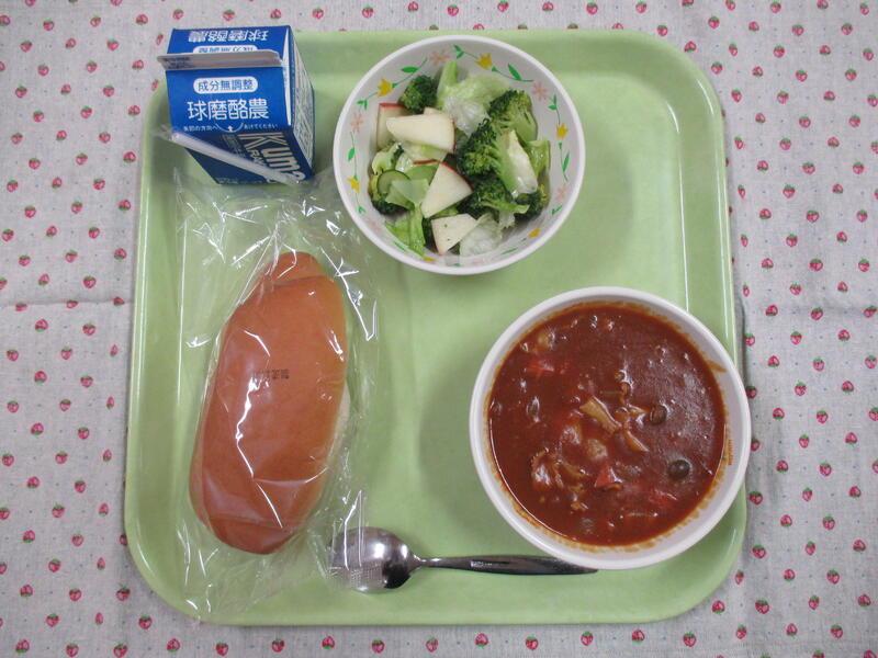 今日の献立は、麦ごはん、牛乳、スープカレー、フレンチサラダ、ヨーグルトでした。