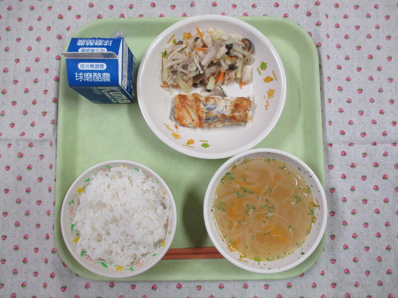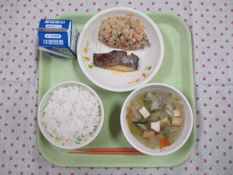 今日の献立は、麦ごはん、牛乳、塩さば、みそ汁、ごま酢あえでした。