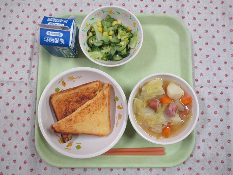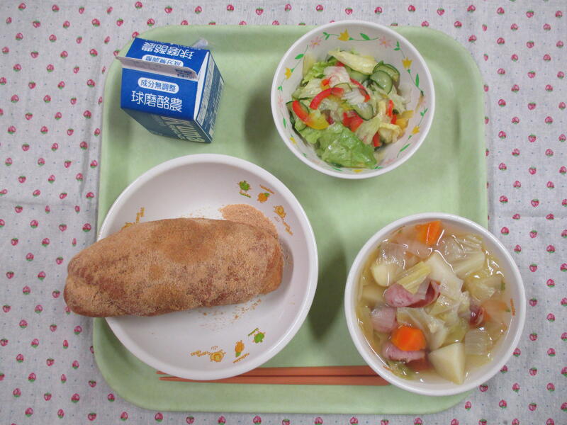 今日の献立は、きなこ揚げパン、牛乳、ポトフ、チキンサラダでした。