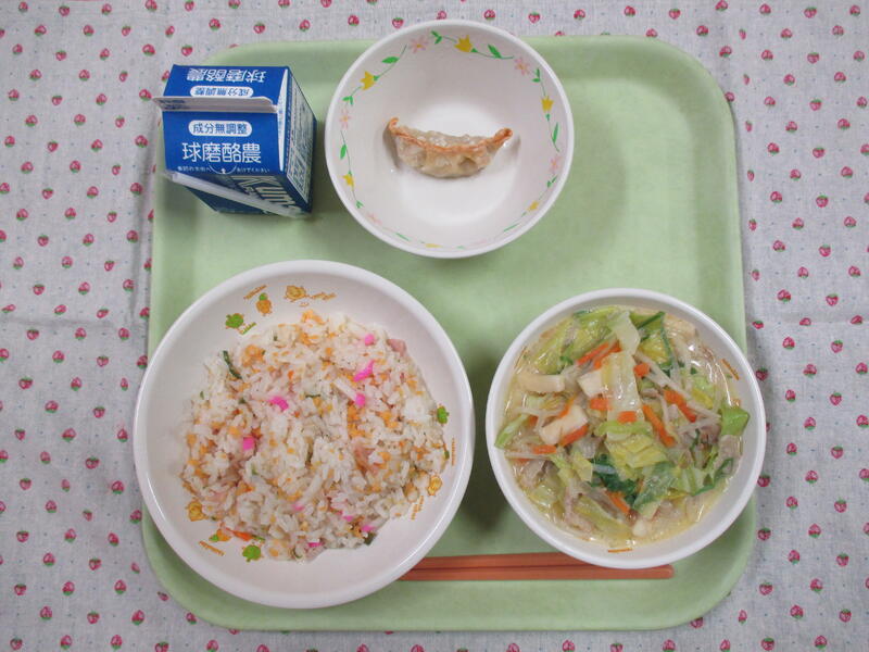 今日の献立は、ホイコーロー丼、牛乳、わかめスープ、焼ぎょうざでした。