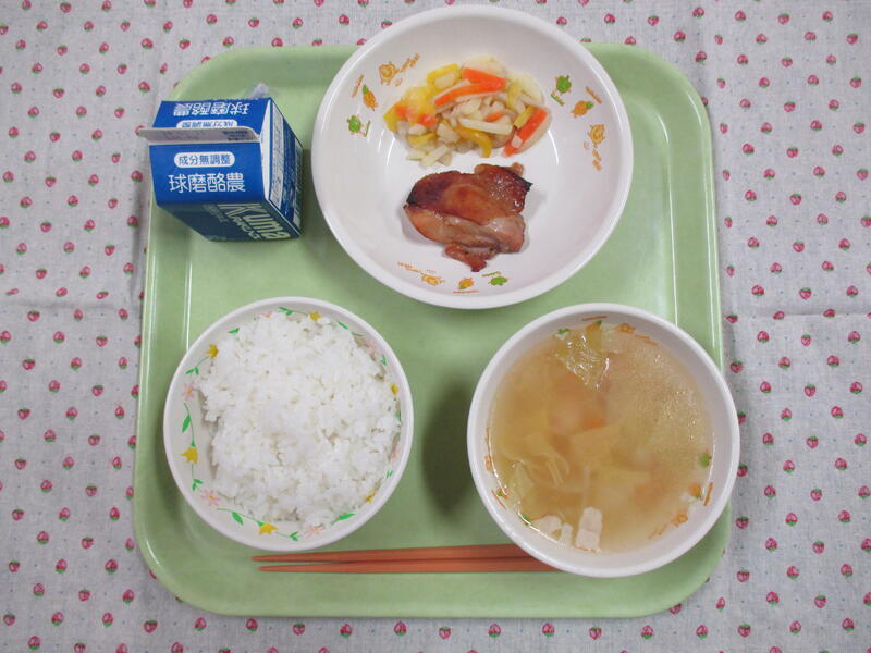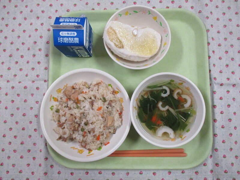 今日の献立は、チキンライス、牛乳、コンソメスープ、甘夏サラダでした。