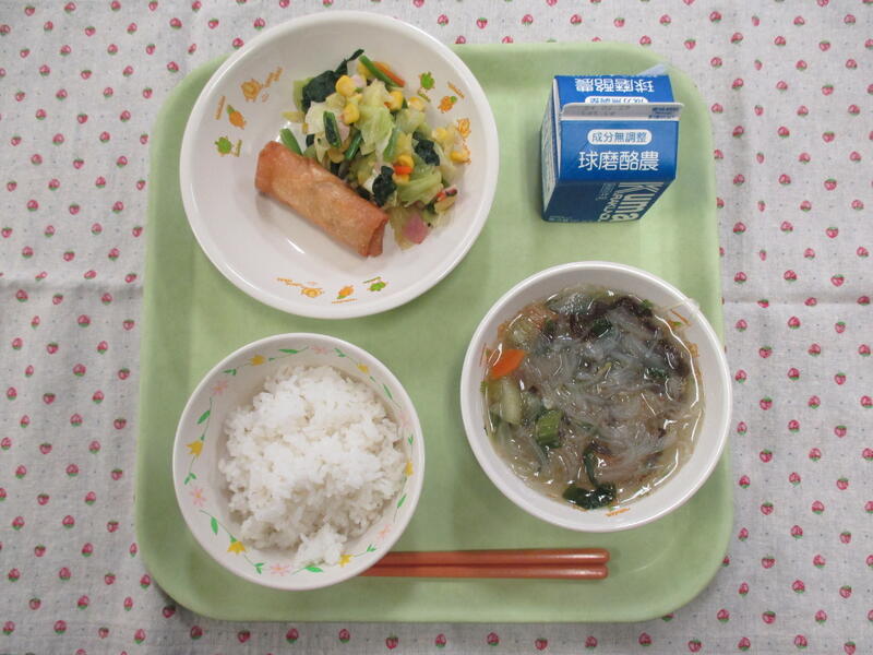 今日の献立は、ジャージャー麺、牛乳、春巻き、杏仁豆腐でした。