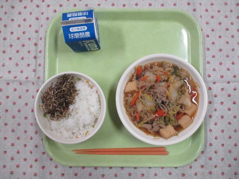 今日は水道の水も使用できるようになり、通常の給食でした。特に今日は1年生のリクエストメニューで、ナポリタンやぶどうゼリーと子供たちが大好きな物がならびました。改めて八竜小の給食は最高と感じました。今日もおいしくいただきました。