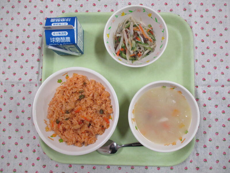 今日の献立は、チキンライス、牛乳、野菜スープ、コールスローサラダでした。