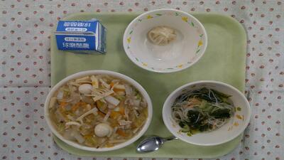 今日の献立は、麦ごはん、牛乳、豚キムチ、春雨スープでした。
