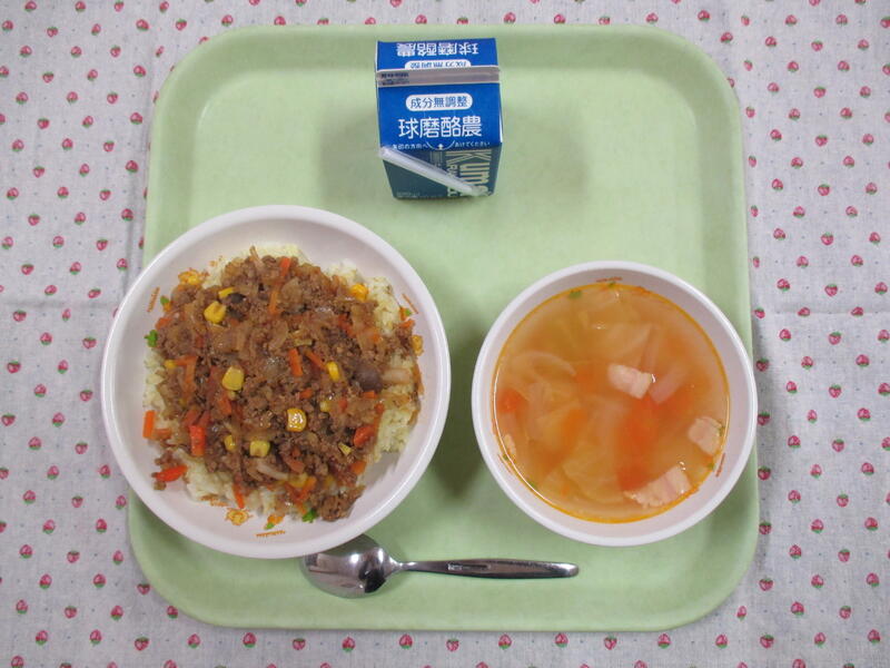 今日は、子供たちが大好きなチキンライスでした。子供たちの笑顔で食べていました。また、野菜スープも柔らかい味で、キャベツの甘みが出ていて、チキンライスとのバランスがよかったです。今日もおいしくいただきました。