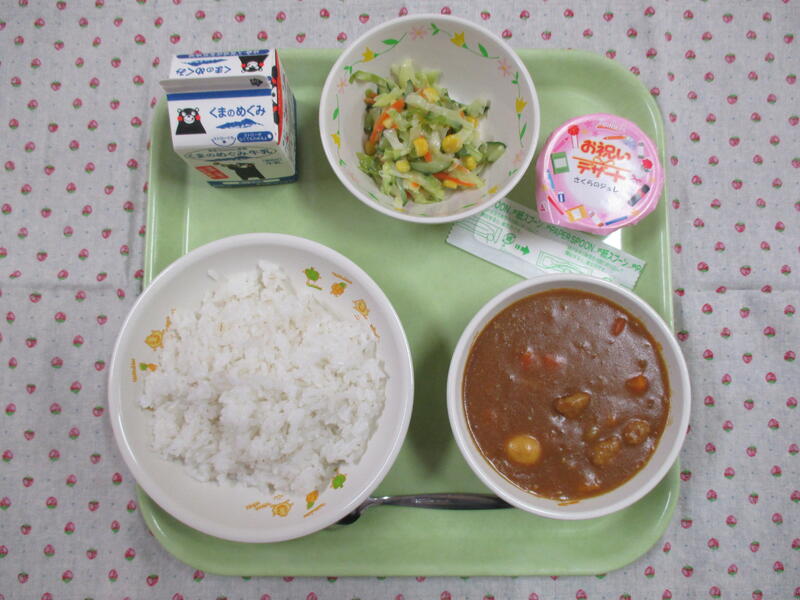 今日の献立は、ポークカレー、牛乳、ヨーグルト和えでした。
