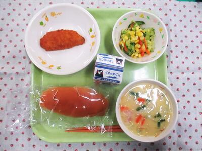 今日の献立は、コッペパン、牛乳、ベジタブルチャウダー、ホキフライ、グリーンサラダでした。