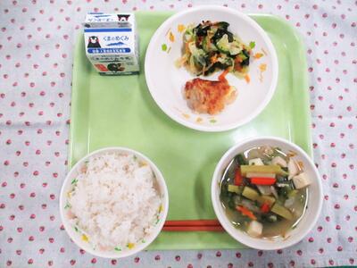 今日の献立は、麦ご飯、牛乳、鶏肉のみそマヨネーズ焼き、わかめの酢の物、さつま汁でした。