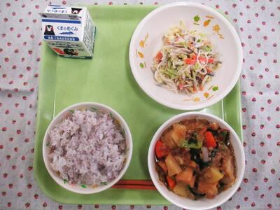 今日の献立は、麦ごはん、牛乳、鶏の照り焼き、すまし汁、春雨の酢の物でした。