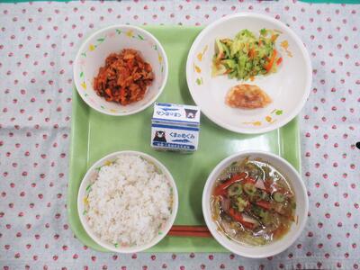 今日の献立は、キムタクごはん、牛乳、春雨スープ、ぎょうざ、野菜の中華和えでした。