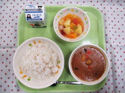 今日の献立は、カレーライス、牛乳、フルーツ和えでした。