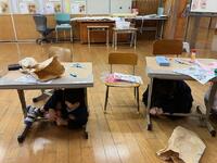 シェイクアウト訓練を実施しました。シェイクアウト訓練は、地震を想定して、一斉に身の安全を守る行動をとる訓練をすることで、自分の安全は自分で守るという意識を高めることを目的としています。特に地震の際の安全確保行動1-2-3「まず低く、頭を守り、動かない」を意識して練習しました。