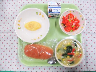 今日の献立は、ミルクパン、牛乳、魚のピザ焼き、とろたまスープでした。