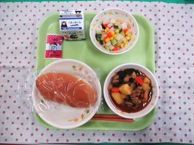 今日の献立は、コッペパン、牛乳、じゃがいものケチャップ煮、大豆と大根のサラダ、マーシャルビーンズでした。