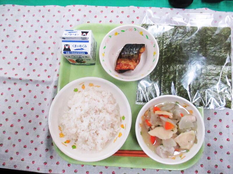 今日の献立は、セルフおにぎり、牛乳、塩さば、栄養すいとんでした。